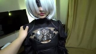 Yorha 2b from Nier Automata in cosplay hotel room blowjob action